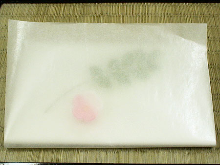 水菓子用の懐紙です。水菓子を頂く時に懐紙の上へ1枚重ねると水菓子が懐紙につきません。画像は紙質が分かるよう、1枚めくって菓子を挟んだ状態です。模様ではございませんので御注意下さい。