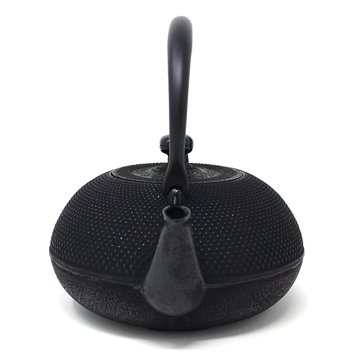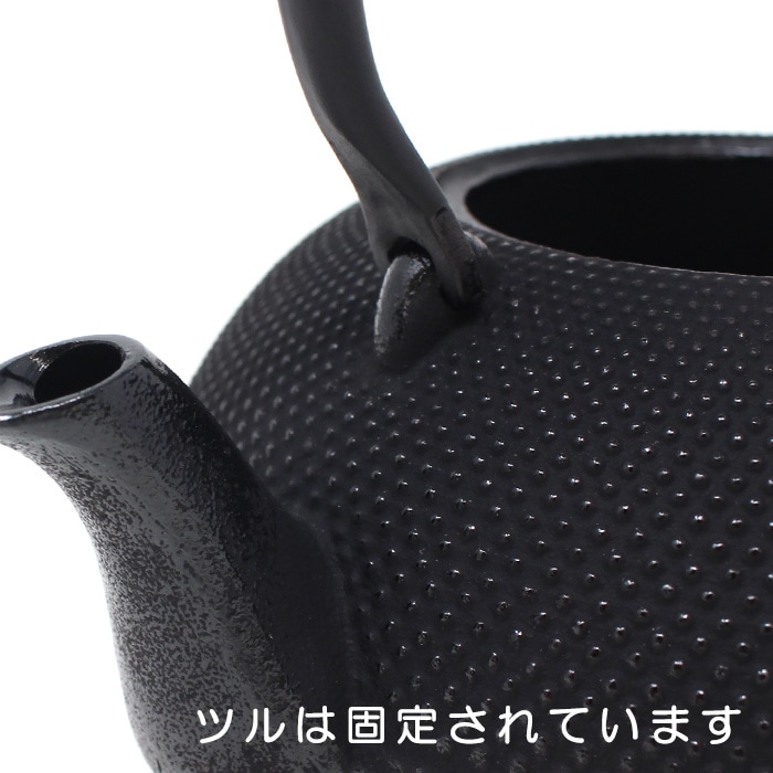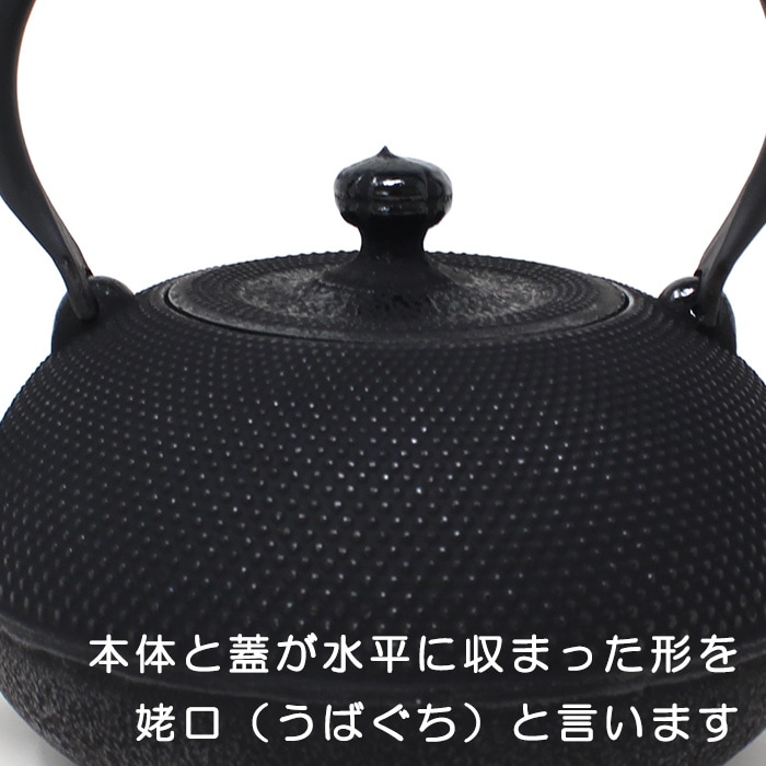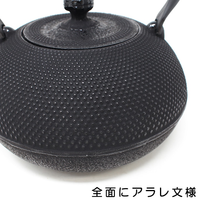 奥州・岩手県「南部鉄器」の鉄瓶です。南部鉄瓶はその均一した厚みにより優れた熱伝導力と保温力をもちます。 鉄瓶で沸かしたお湯には鉄分が溶出し、まろやかな味わいになります。またその美しい見た目から道具としてだけではなく、インテリアとしても活躍してくれます。 及春の鉄瓶は、内側をホーローなどでコーティングせず鉄の利点を生かした丁寧な仕上げ。最近では価格競争のために「金気止め」の工程を省く鋳造所も増える中、必ず最終仕上げとして行っています。ぜひ末永く大切にお使いください。 ◎伝統的なアラレ模様を施した鉄瓶です。 アラレ文様は鉄瓶が肉厚になり、保温効果が増すという先人の卓抜な知恵と緻密なデザインが今も受け継がれています。1.2Lと大きすぎず小さすぎず、男女問わず注ぎやすい大きさです。(※ツルは固定されています。)本体と蓋が水平に収まった形を姥口(うばぐち)と言います。直火はもちろん、IH調理器での使用も可能なので新生活や新築祝いのギフトにもおすすめです。