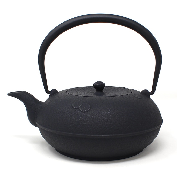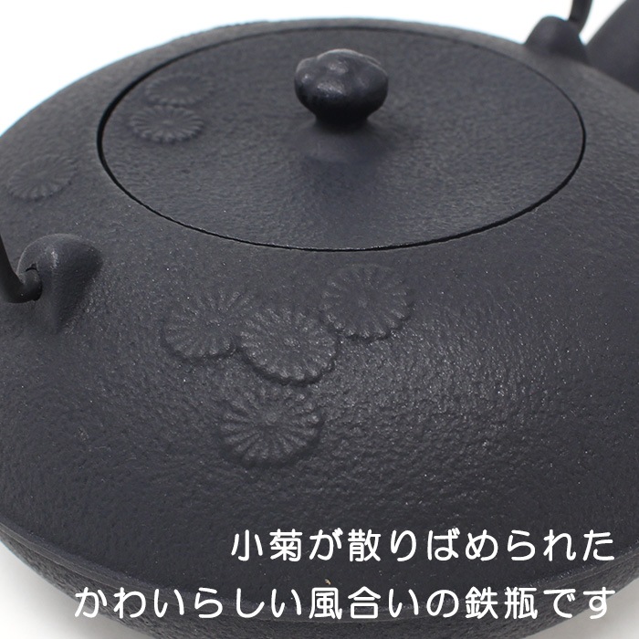 奥州・岩手県「南部鉄器」の鉄瓶です。南部鉄瓶はその均一した厚みにより優れた熱伝導力と保温力をもちます。 鉄瓶で沸かしたお湯には鉄分が溶出し、まろやかな味わいになります。またその美しい見た目から道具としてだけではなく、インテリアとしても活躍してくれます。 OIGENの鉄瓶は、釜焼き工程を行いより伝統的な錆止めを施しています。また内部も無塗装の素焼きの為、より緻密な湯垢がつきやすく、自分だけの鉄瓶を育てていく楽しみもございます。ぜひ末永く大切にお使いください。 ◎かわいらしい小さな菊の花が散りばめられた1Lサイズの鉄瓶。蓋のつまみ部分は、花のつぼみをモチーフにしたデザインです。ツルは収納に便利な倒れるタイプ。大きすぎず小さすぎず、男女問わず注ぎやすい大きさです。底面は通常より厚みがあり、パワーの強い200VIHにも対応しています。直火はもちろん、IH調理器での使用も可能なので新生活や新築祝いのギフトにもおすすめです。