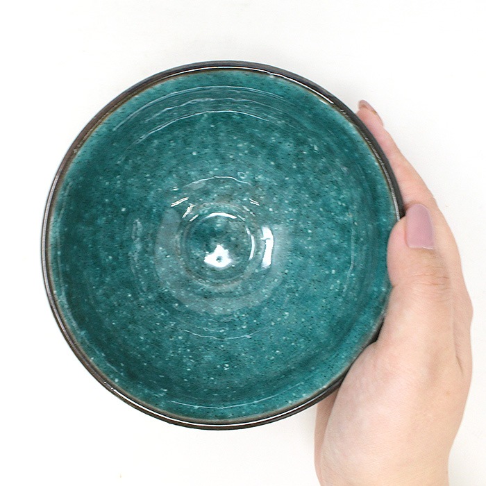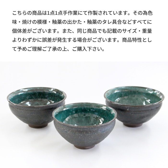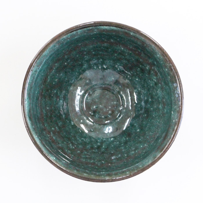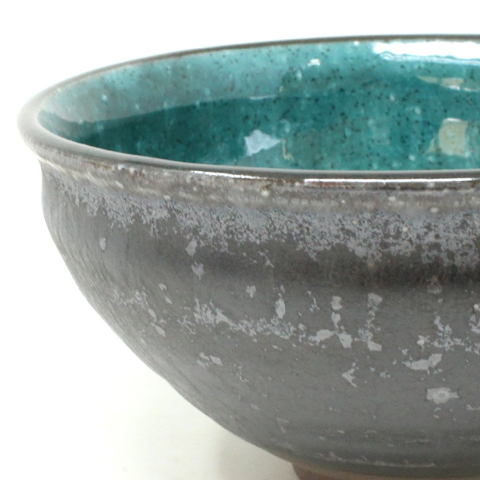 内側のトルコブルーが美しい天目型の抹茶茶碗です。すり鉢のように口が開き、高台が小さいのが特徴です。お稽古・ご自宅用などにおすすめです。