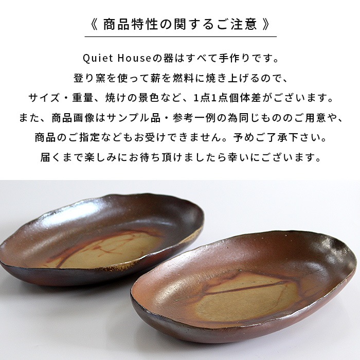 「Quiet House」より「オーバルボウル L」です。クワイエットハウスさんの定番プレートです。シンプルで使いやすさを追求した形は普遍的でどんなシーン・テイストでも馴染みます。 楕円形プレートは意外となんにでもはまります。定番のカレー皿・パスタ皿はもちろんのこと、ご飯とおかずをのせてワンプレートとしたり、大人数で集まるときはメインやサラダを乗せる大皿としても使用できます。 現代の暮らしに馴染むスタイリッシュな形と、備前焼らしい荒々しい質感が同時に味わえる器です。ぜひ、暮らしの中でご愛用ください。 《備前焼の特性》 備前焼とは釉薬を一切使用せず、1200〜1300度の高温で焼成する焼締め陶です。そのため「投げても割れない」と言われるほど堅く頑丈な作りになっています。また、備前焼の表面には微細な凹凸があり、それによって保温力が強くホット飲料など冷めにくいです。使い始めはこのザラっとした感じが気になるかもしれませんが、使っていくうちに表面が滑らかに育っていきます。