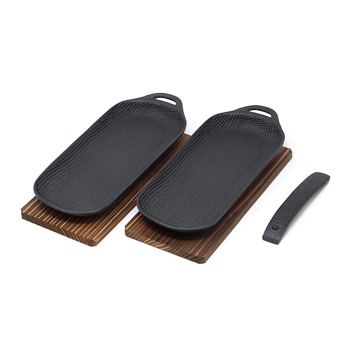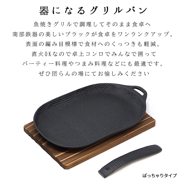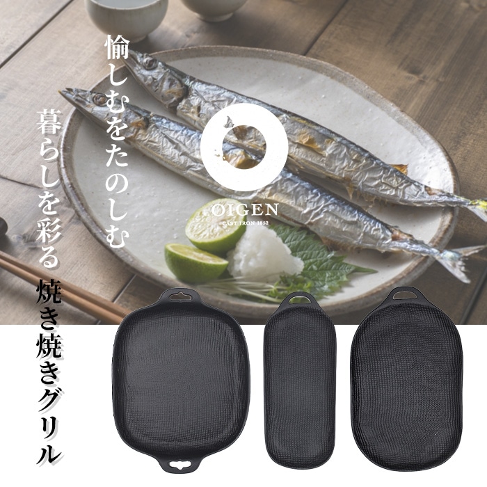 直火はもちろん、魚焼きグリルに入れて使える鉄の焼き皿「焼き焼きグリル」。スリムタイプは2人それぞれで使用、また違う食材をグリルで一度に調理できるのが特徴です。グリルでは鉄器の蓄熱性で食材をひっくり返さずに焼くことができます。グリルの出し入れは、専用の着脱式ハンドルをご使用ください。料理はそのまま木台にのせ食卓へ。魚はもちろん、野菜やお餅、焼きおにぎりも美味しく焼けます。 *Point* ・一般的な魚焼きグリルにぴったり!グリルパンとして庫内を綺麗に保ちます ・専用取っ手付きでグリル庫内への出し入れも簡単 ・南部鉄器の蓄熱性であつあつのお料理をそのまま食卓へ ・ガスコンロでの直火使用ももちろんOK! ・焼くだけで鉄分補給にも *鉄を育てるコツ* ・使い始め(未使用時)には「油ならし」を行いましょう! ・ご使用後はタワシ・サラサなどを使用し水洗いでOK ・濡れたままはサビの原因に!よく乾燥を。 ・上手にお料理するコツは、調理前に焼き焼きグリル本体と、魚焼きグリル庫内を温めておきます。加熱後、油を小さじ1程度表面全体にムラなくなじませます。鉄器の表面にツヤがでるぐらいが目安です。