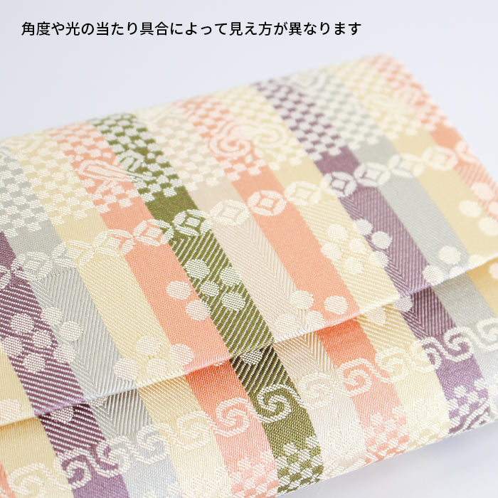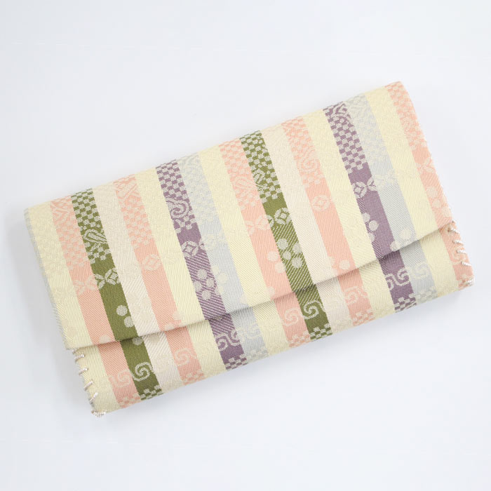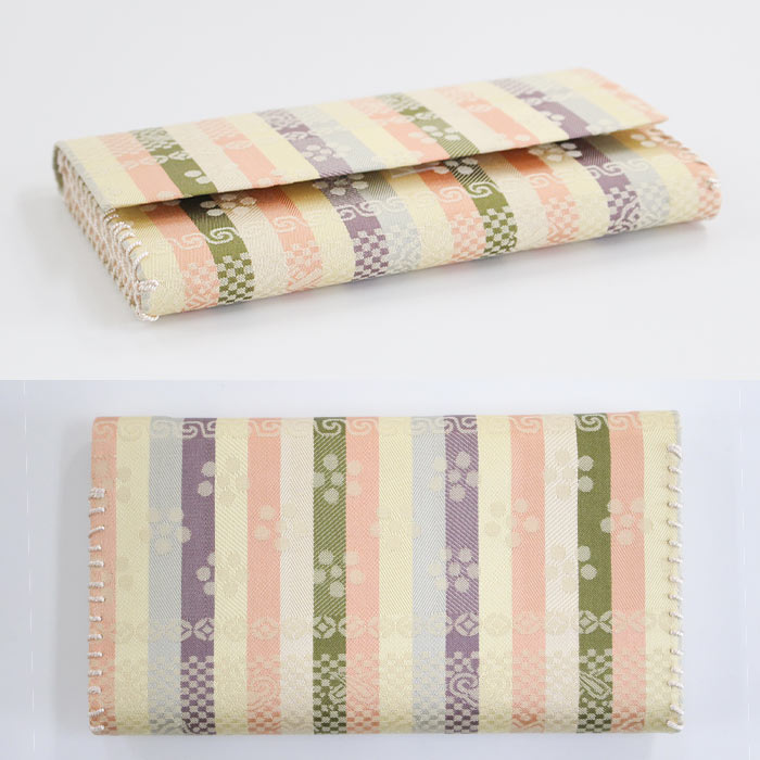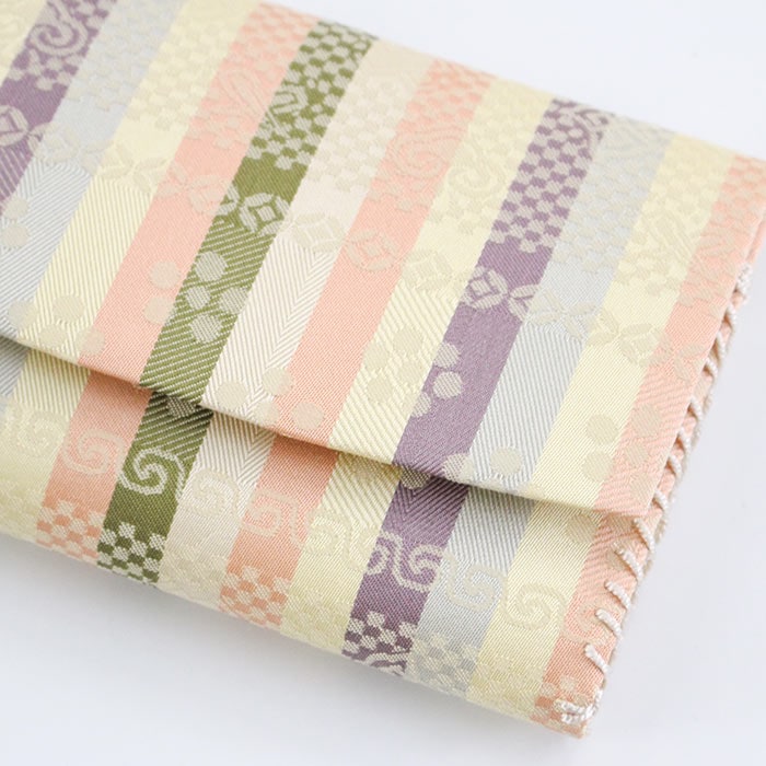 中川政七商店謹製 名物裂正絹の懐紙入です。内地はベージュ、ホックなどの留め具はありません。簡易的な内ポケットが一つあります。お稽古道具一式を収納できます。 《名物裂とは》 名物裂とは、絹織物の呼び名のひとつで、茶の湯において、名物と呼ばれた茶道具を入れる袋や袱紗掛け物の表装、帯地などに用いられた布地の総称のことを指します。 《懐紙入とは》 帛紗ばさみ・帛紗バッグとも言います。お茶のお稽古やお茶会に必要な道具をひとつにまとめて入れておくものです。 《裂地の説明 -伊予簾-》 小堀遠州が中興名物「伊予簾茶入」の仕覆にこの裂を添えたことから、この名称が付けられており、古今名物類聚には「小石畳」として 収録されている裂です。縹・白・萌葱・紅など数色の縞に、石畳宝尽くし紋、 梅鉢紋が織り出されています。縞だけでは強すぎる印象を全面に文様を表すことにより、柔らかな風情にした美しい裂です。