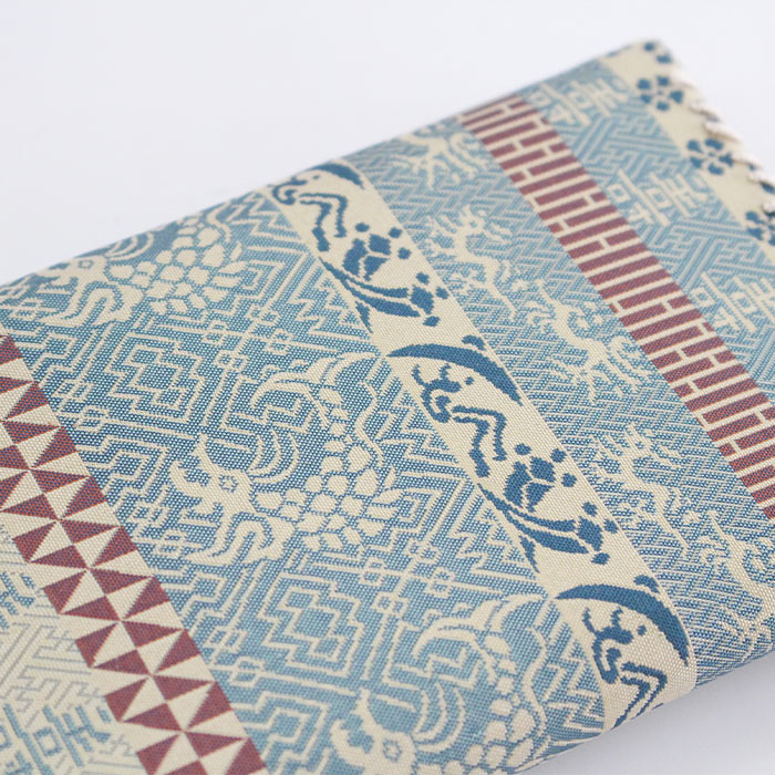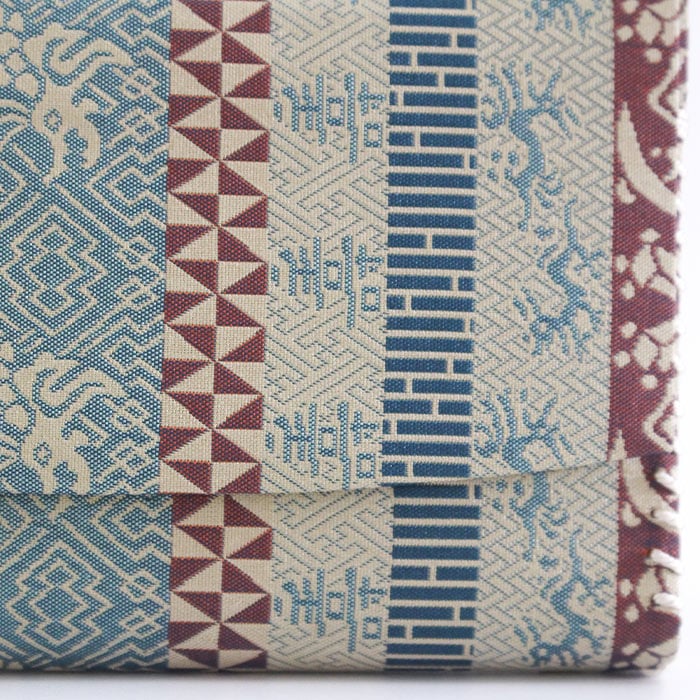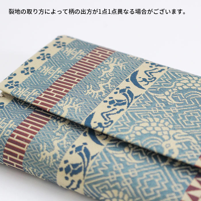 中川政七商店謹製 名物裂正絹の懐紙入です。内地はベージュ、ホックなどの留め具はありません。簡易的な内ポケットが一つあります。お稽古道具一式を収納できます。 《名物裂とは》 名物裂とは、絹織物の呼び名のひとつで、茶の湯において、名物と呼ばれた茶道具を入れる袋や袱紗掛け物の表装、帯地などに用いられた布地の総称のことを指します。 《懐紙入とは》 帛紗ばさみ・帛紗バッグとも言います。お茶のお稽古やお茶会に必要な道具をひとつにまとめて入れておくものです。 《裂地の説明 -寿文字鯱文風通-》 織は二重経・二重緯の風通組織です。文様は段で構成され、鯱紋・宝文・龍文・木賊(とくさ)文・寿文字文・花文・角に飛鶴文・鱗文を配しています。中でも鯱紋はめずらしく、姿は魚で頭は虎・尾ひれを常に空へ向けた動物で、大棟の両端に取り付け、家事の際には水を噴き火を消すといわれます。