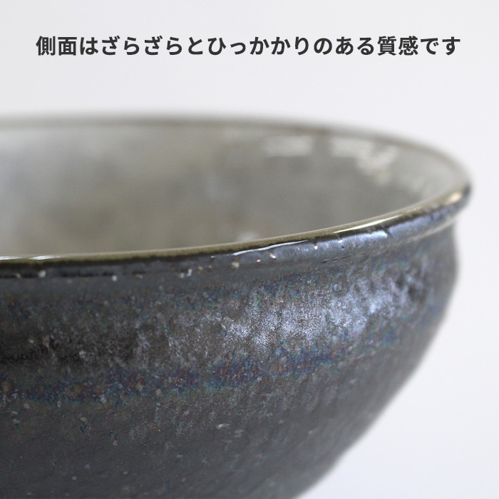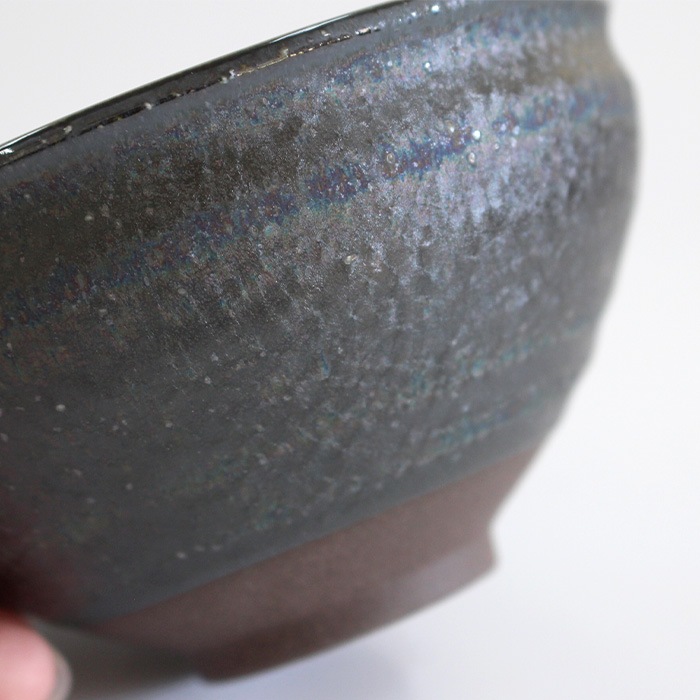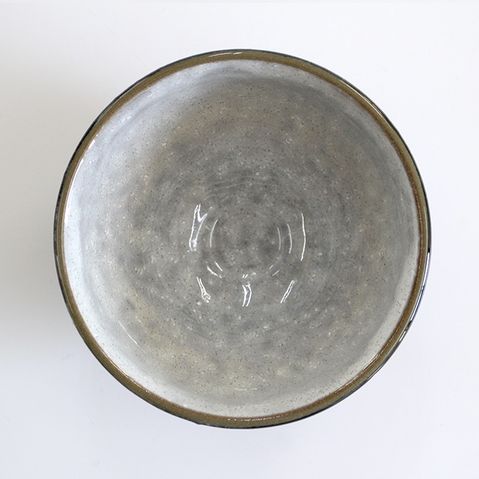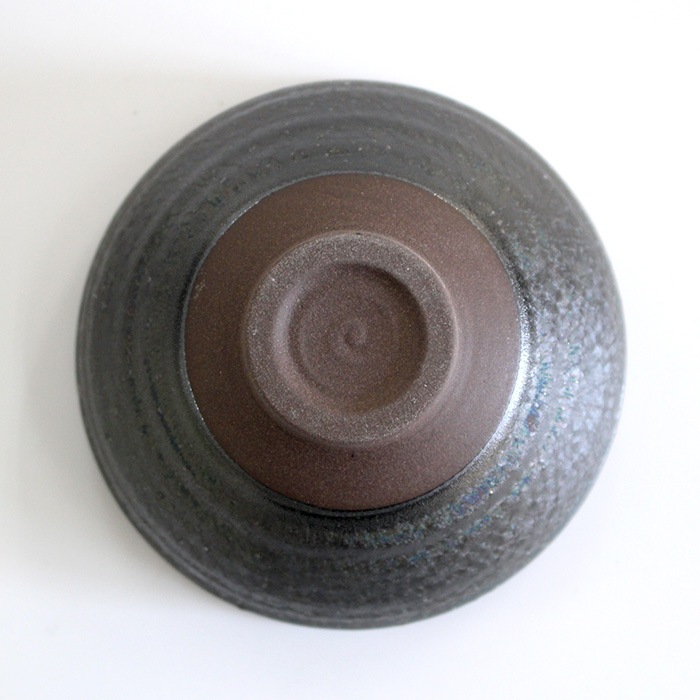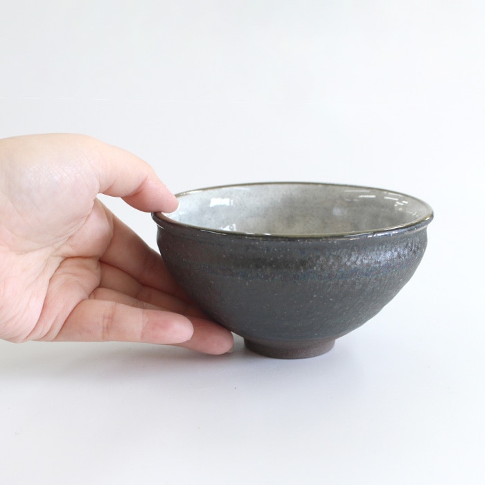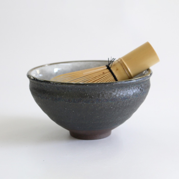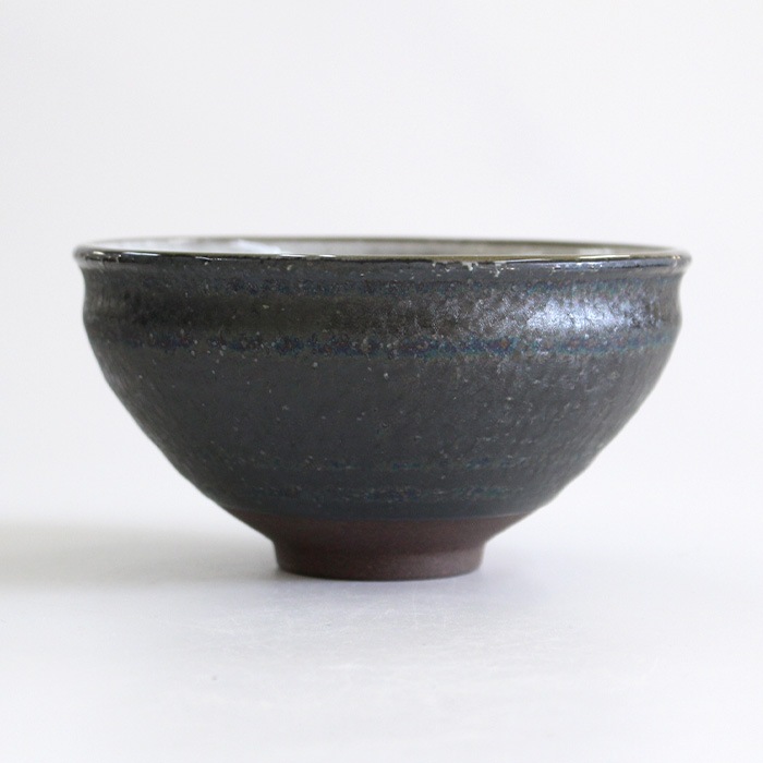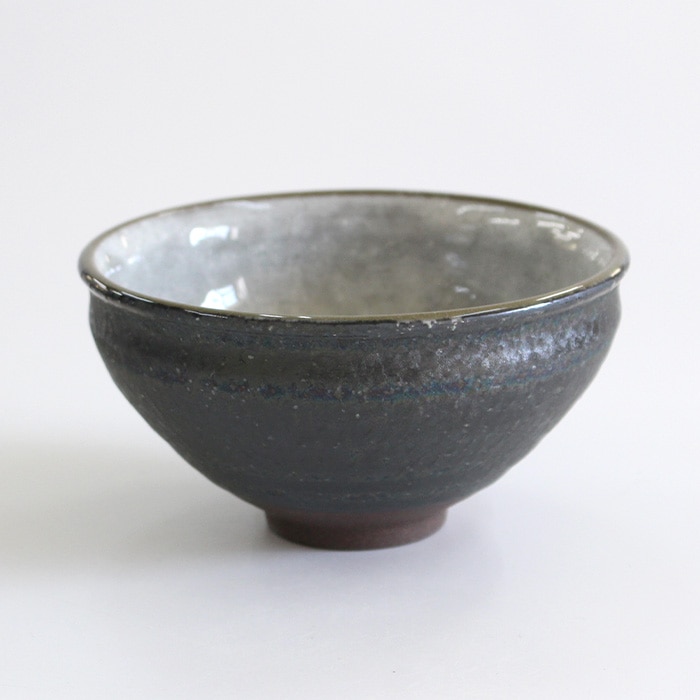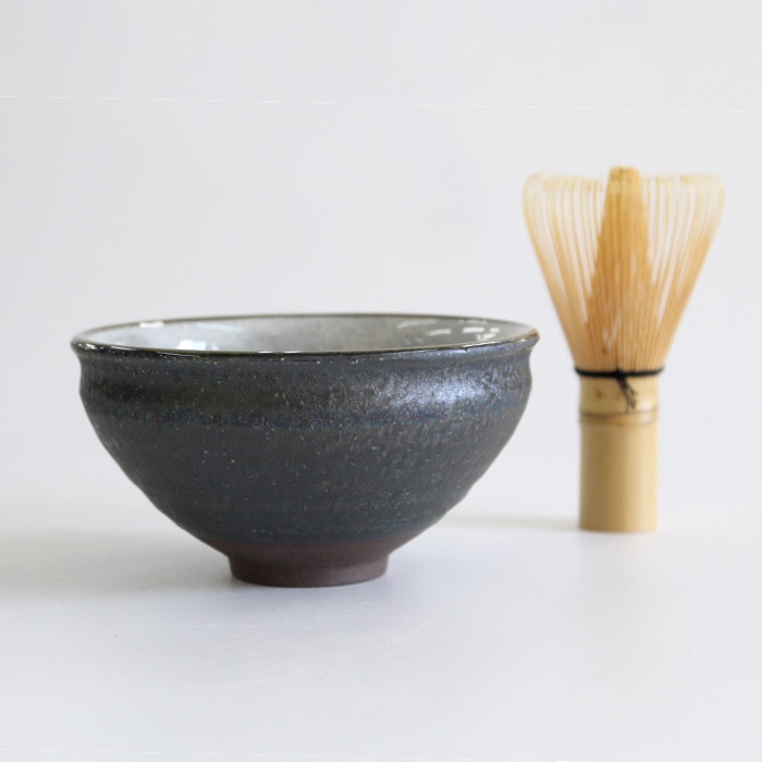 天目型の抹茶茶碗です。内側はつるっとした釉薬、側面はざらざらとした質感です。バイカラーが面白いお茶碗です。お稽古用・ご自宅用におすすめです。