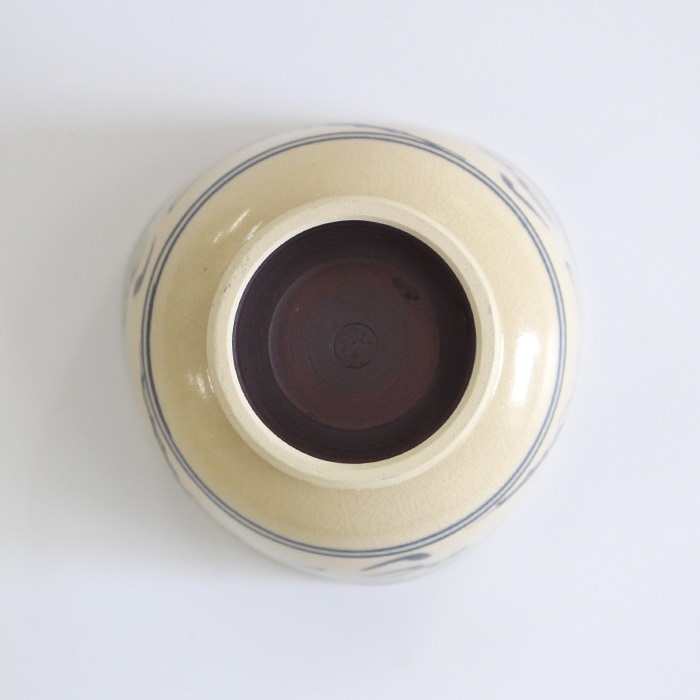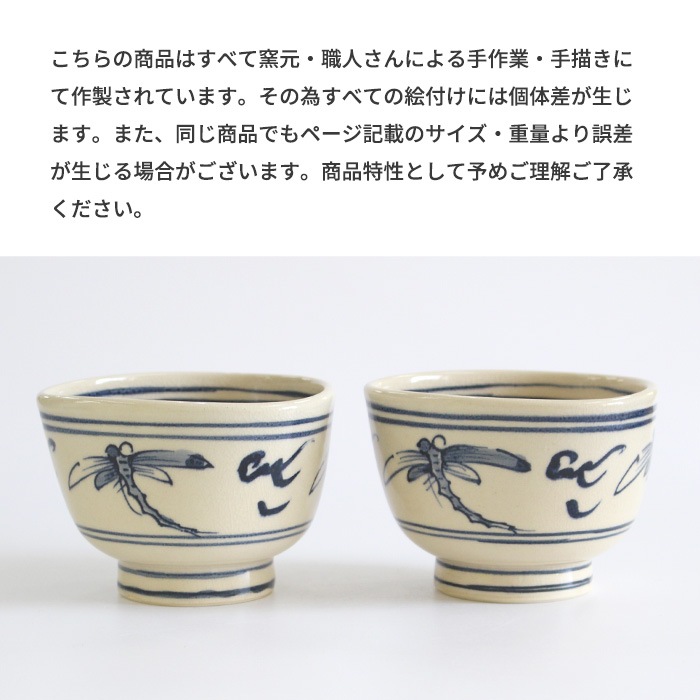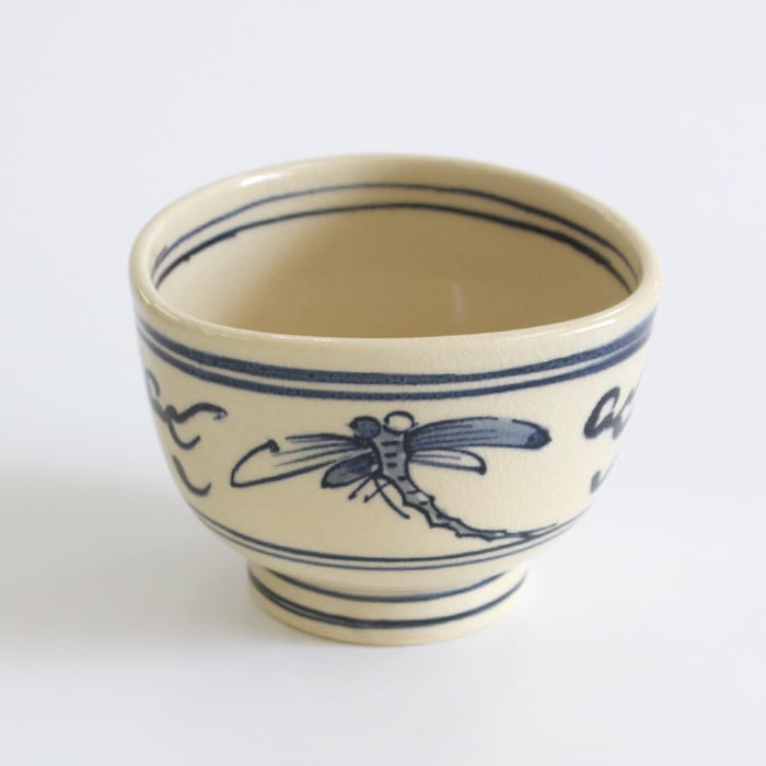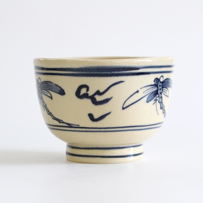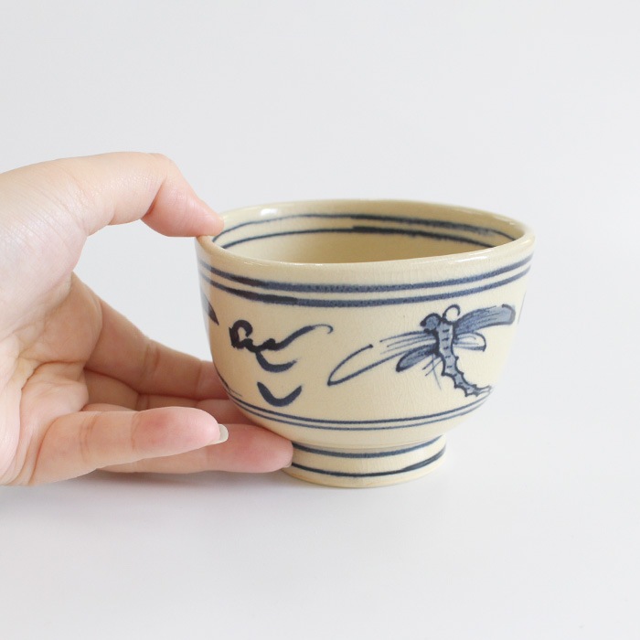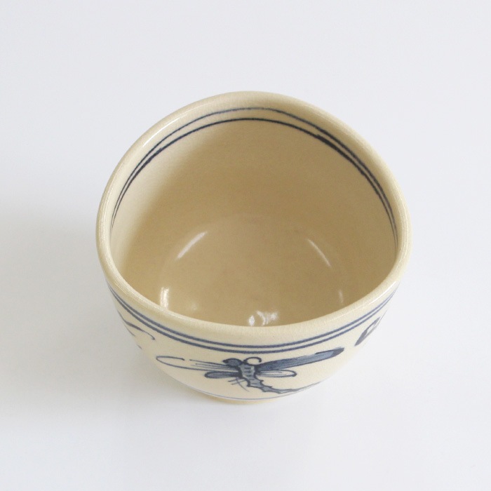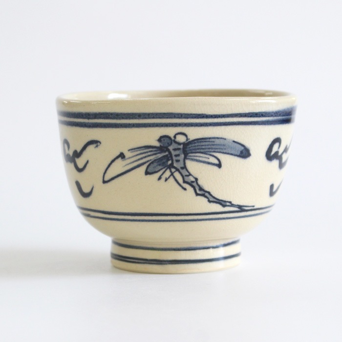 瓜生静竜 安南蜻蛉 小茶碗です。上からみると口縁が三角形になっており、高台が少し高めに作られているのがデザインのポイントになっています。 安南(あんなん)とはベトナムのことで、そこから渡来した茶器を安南茶碗や安南焼といいます。安南茶碗の代表的な図柄であるトンボが描かれており通年使い勝手が良いです。トンボが飛び交う初夏から秋にかけてや端午の節句にもおすすめです。小茶碗サイズですので、茶箱や野点の際の仕組みにもコンパクトに収まります。