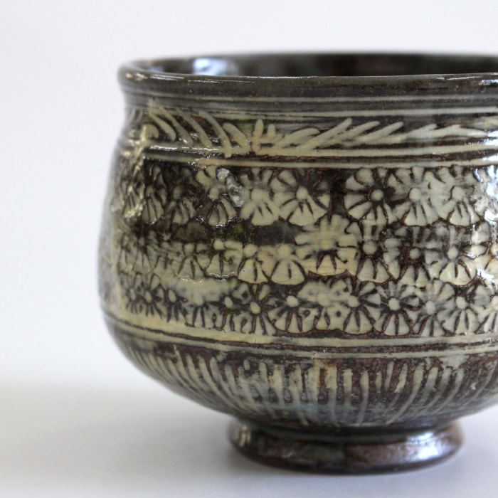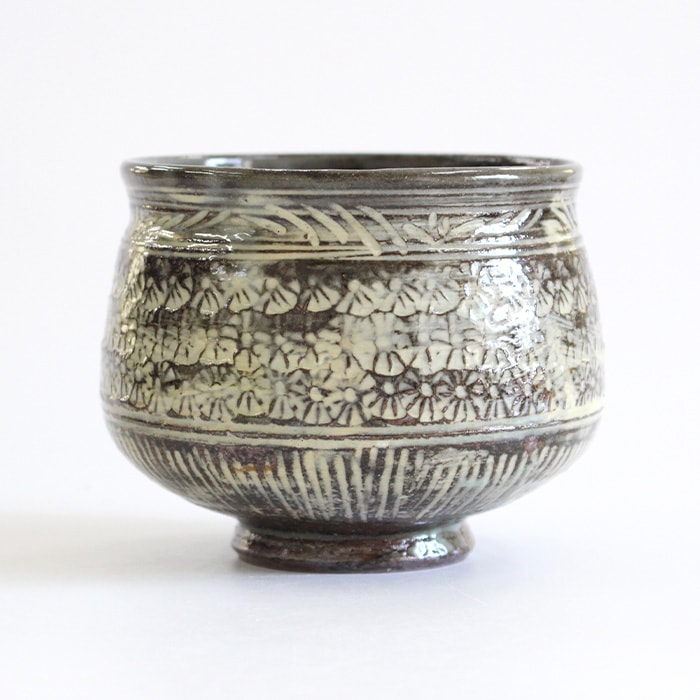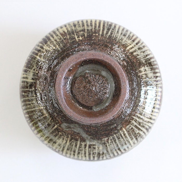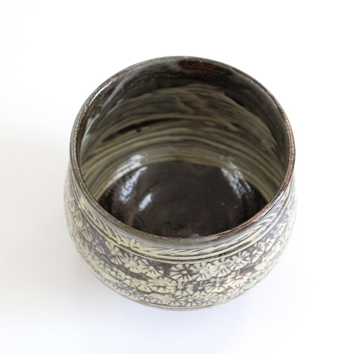 中村与平作 塩笥(しおげ)茶碗 古三島です。塩笥(しおげ)とは、朝鮮半島で日常的に使われていた小壺のことで胴が膨らみ口がすぼまった形をしています。塩や味噌などを保存する器として使われていましたが日本に伝来した後は、茶碗や香炉などとして使われるようになりました。 お茶が冷めにくい形なので冬の時期などにおすすめです。 古三島(こみしま)とは、朝鮮半島から渡来した陶器の一種で、三島手の古いものを指します。