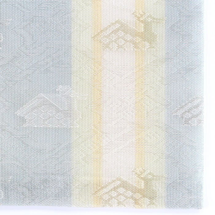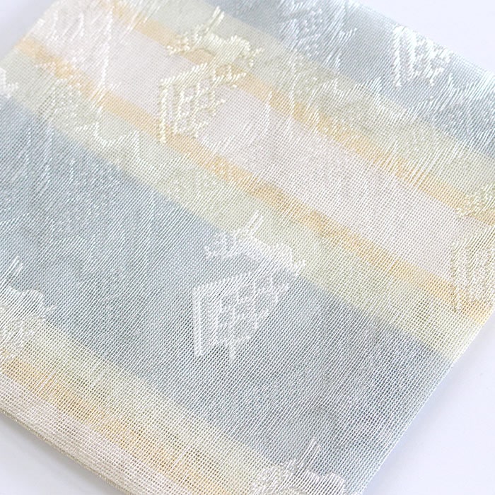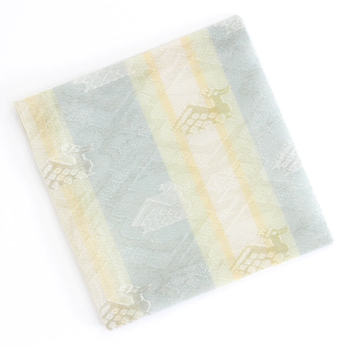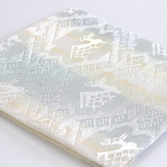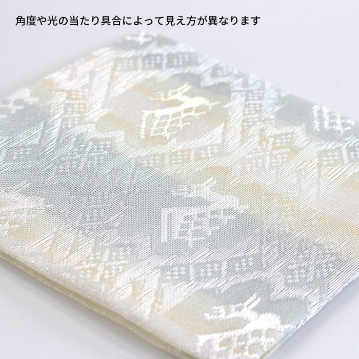 中川政七商店謹製 名物裂 正絹 紗 古帛紗です。夏素材で涼し気です。 《名物裂とは》 名物裂とは、絹織物の呼び名のひとつで、茶の湯において、名物と呼ばれた茶道具を入れる袋や袱紗掛け物の表装、帯地などに用いられた布地の総称のことを指します。 《古帛紗とは》 裏千家にて使用します。お点前用帛紗の1/4程度の大きさで、茶碗を運ぶ際や道具類の拝見時に使用します。 《裂地の説明 有栖川鹿紋》 名物裂の中でも特に有栖川錦は特異なもので鹿・馬。雲龍・鳳凰などの文様があります。この有栖川錦鹿紋は囲む響繋ぎに似た幾何学紋で直線的にまとめられており中近東あたりの雰囲気が強く感じられ、その趣が戦国時代から桃山時代の武将や茶人に愛されたものと思われます。この文様を涼し気な印象の紗組織で織り出した裂です。