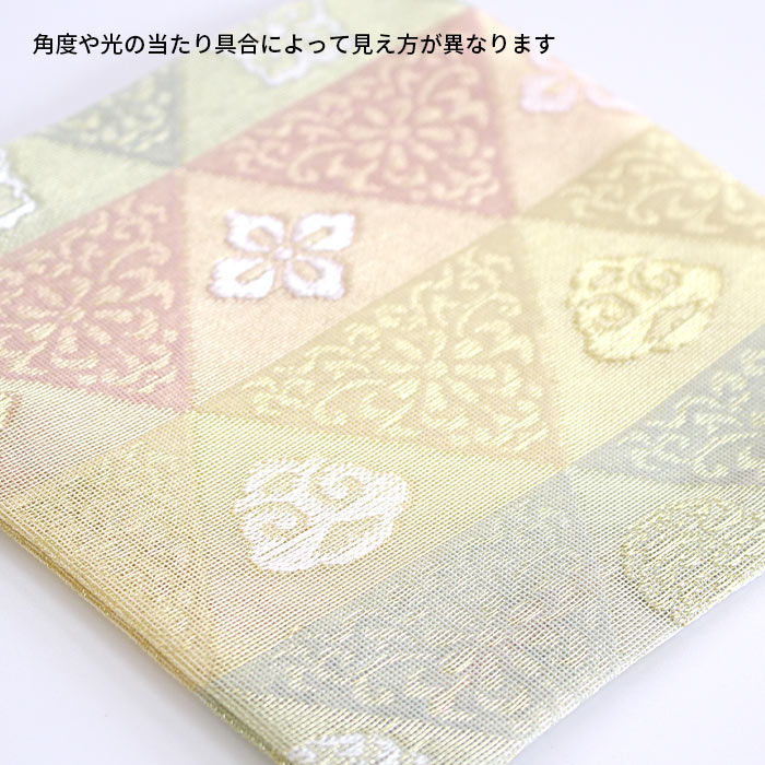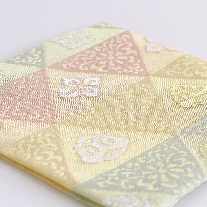 中川政七商店謹製 名物裂 正絹 紗 古帛紗です。夏素材で涼し気です。 《名物裂とは》 名物裂とは、絹織物の呼び名のひとつで、茶の湯において、名物と呼ばれた茶道具を入れる袋や袱紗掛け物の表装、帯地などに用いられた布地の総称のことを指します。 《古帛紗とは》 裏千家にて使用します。お点前用帛紗の1/4程度の大きさで、茶碗を運ぶ際や道具類の拝見時に使用します。 《裂地の説明 宝入鱗文様》 この裂は、能装束の意匠を写したものです。三角形を積み重ねた鱗文様は、幾何学文様として古くから見られます。この中に中国「八宝」思想に由来し福徳の招来として喜ばれる宝文様と、蔓草が旋回し空想的な趣を感じさせる花唐草を交互に配したものです。この文様を紗組織により織り出した裂です。