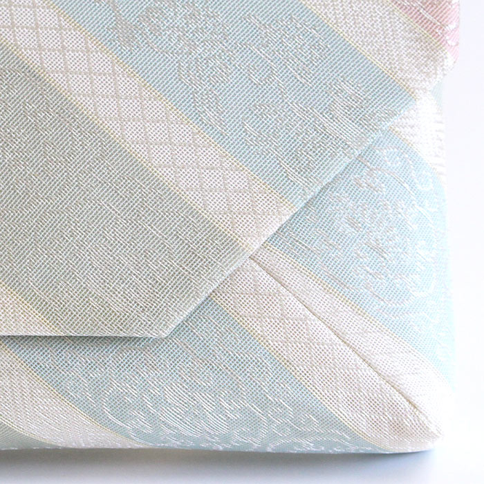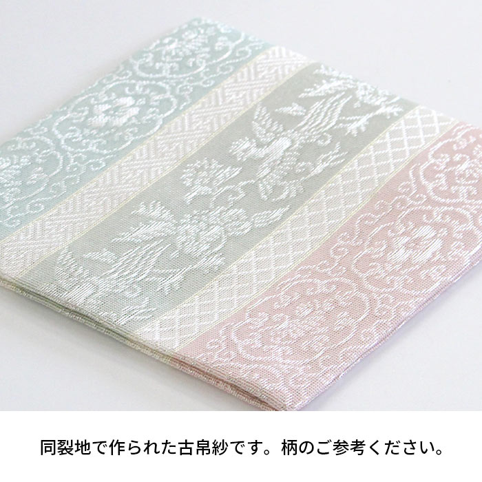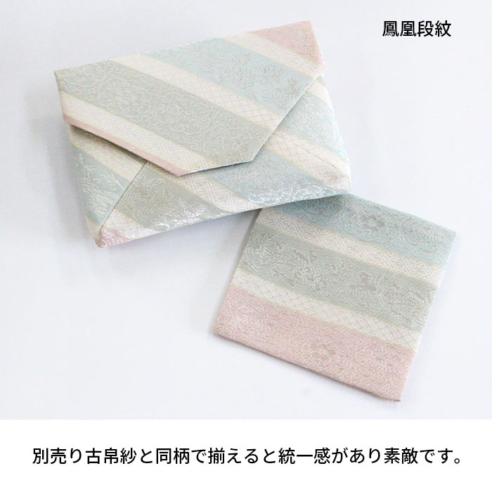 中川政七商店謹製 名物裂 正絹 紗 数寄屋袋です。夏素材で涼し気です。お道具が多くなるお茶会などにご活用ください。 《名物裂とは》 名物裂とは、絹織物の呼び名のひとつで、茶の湯において、名物と呼ばれた茶道具を入れる袋や袱紗掛け物の表装、帯地などに用いられた布地の総称のことを指します。 《裂地の説明 鳳凰段紋》 鳳凰は桐にのみ棲み、竹の実を食べるとされ、明君が出て天下泰平になると出現する瑞鳥です。この文様は鳳凰と唐草を交互にあらわし、菱・紗菱形文を段に構成した意匠で、落ち着いた中に華やかな印象が感じられます。この文様を紗組織により織り出した涼し気に感じられる裂です。