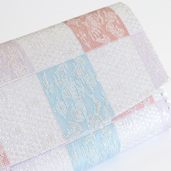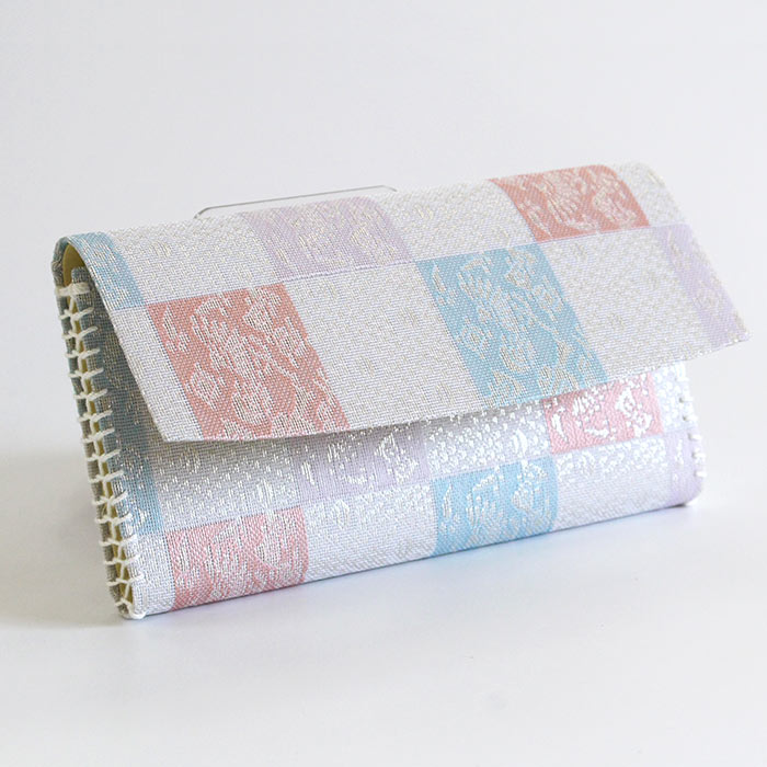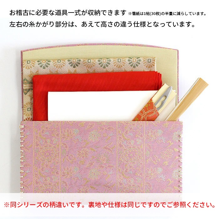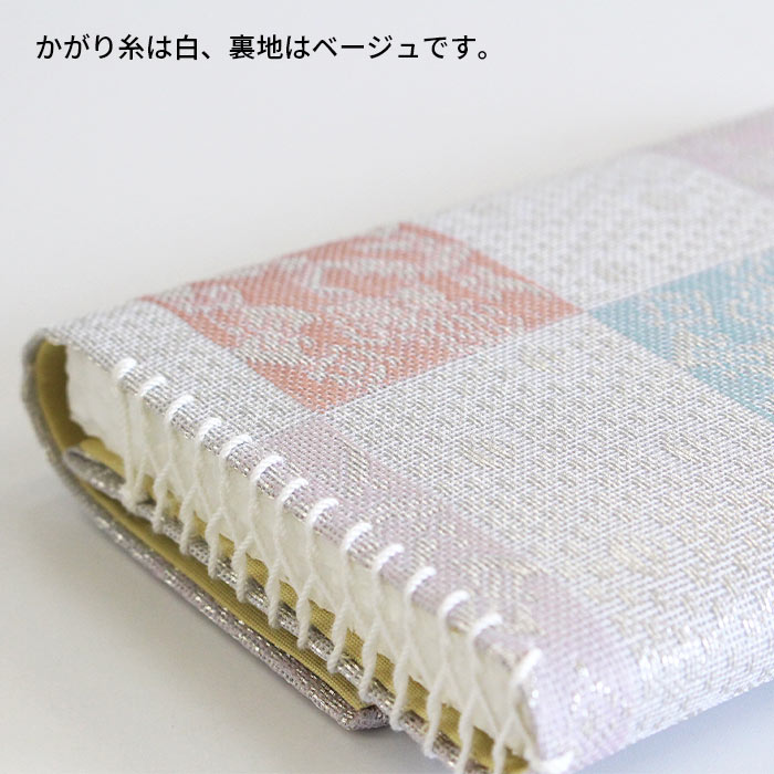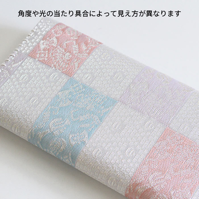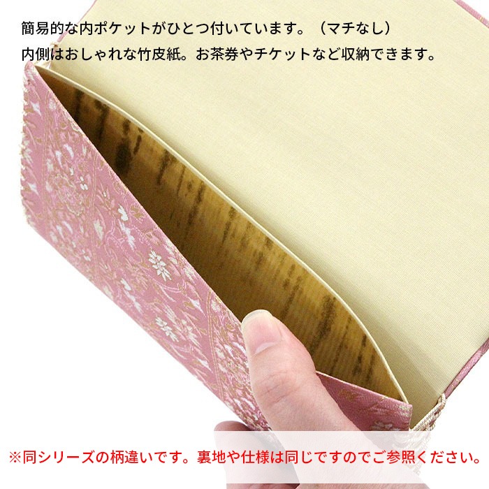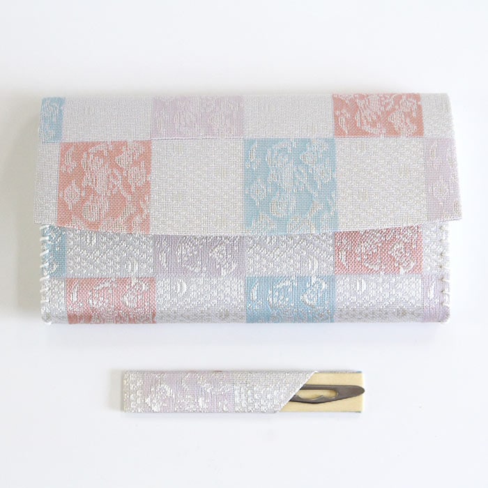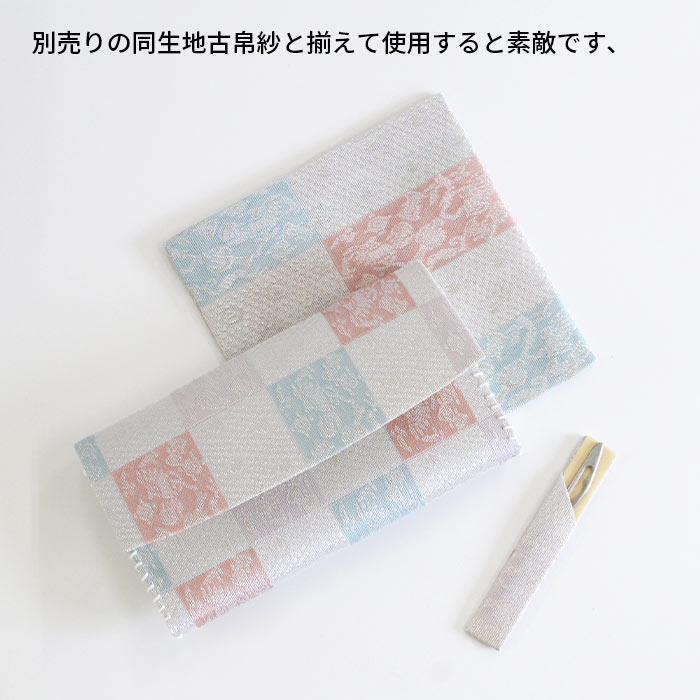 名物裂 正絹 紗 懐紙入と楊枝の2点セットです。同じ生地で揃えておりますので統一感があります。夏素材で涼し気です。 懐紙入の内地はベージュ、ホックなどの留め具はありません。簡易的な内ポケットが一つあります。お茶券やチケットなど入れておくのに便利です。お稽古道具一式を収納できます。楊枝はステンレス製のものをお付けしております。 《名物裂とは》 名物裂とは、絹織物の呼び名のひとつで、茶の湯において、名物と呼ばれた茶道具を入れる袋や袱紗掛け物の表装、帯地などに用いられた布地の総称のことを指します。 《懐紙入とは》 帛紗ばさみ・帛紗バッグとも言います。お茶のお稽古やお茶会に必要な道具をひとつにまとめて入れておくものです。蓋のあるものを三ツ折といいます。 《裂地の説明 市松宝尽くし》 福徳を招来するものとして喜ばれた宝尽くし文は、如意宝珠・笠・打出の小槌・丁字・七宝などの多数の文様が古くよりあります。この裂は、長方形を互い違いに配した市松文の中に、整列した如意珠と宝を散りばめた文様で、美しく整った趣と洒落た雰囲気を涼し気な印象の紗組織で織り出した裂です。
