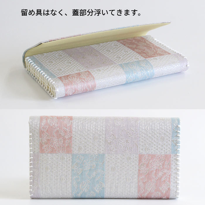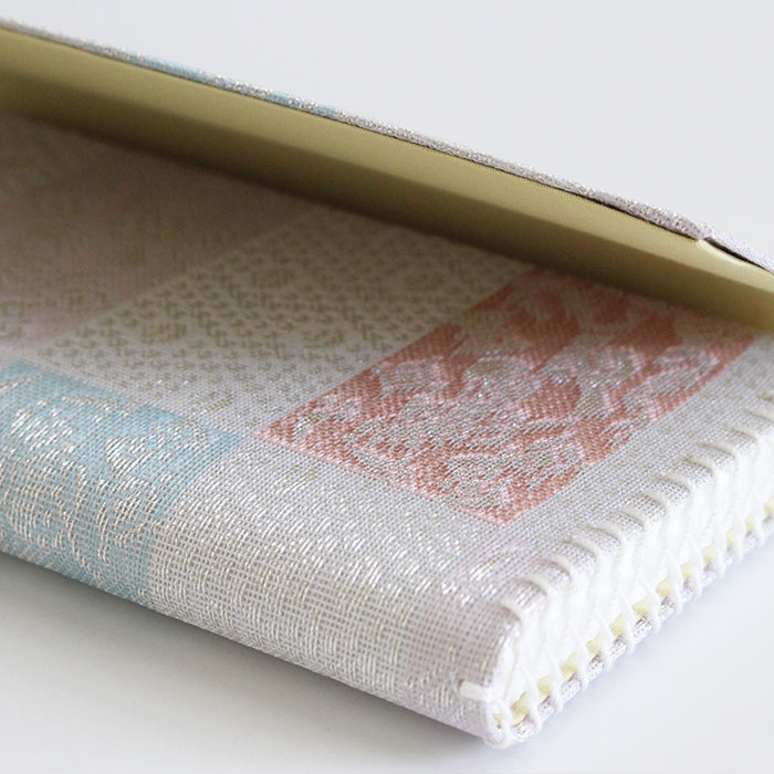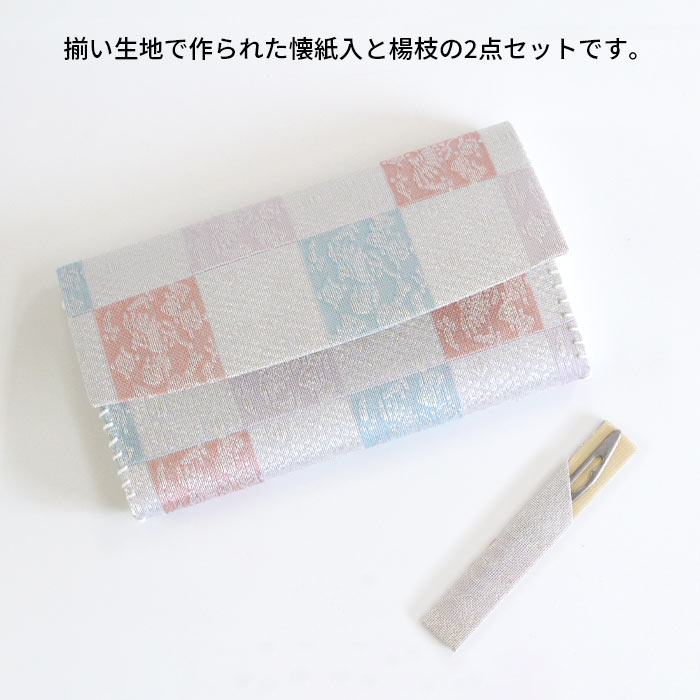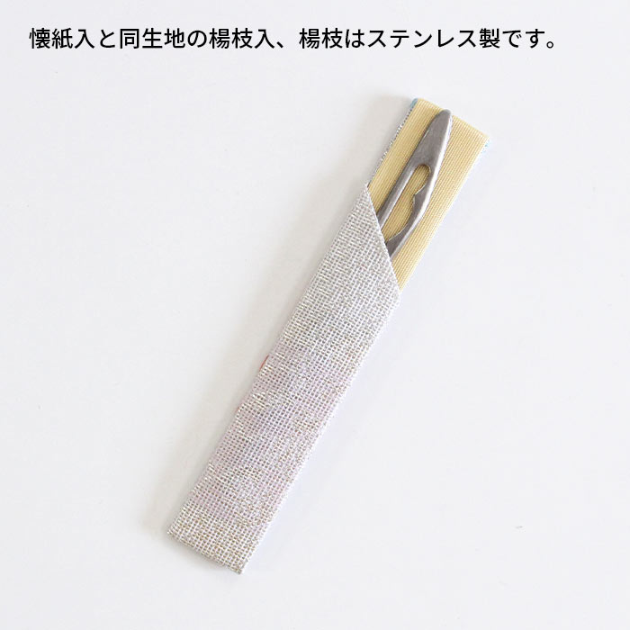 《懐紙入》 表地/正絹、 裏地・かがり紐/レーヨン 、芯/紙 《楊枝入》 表地/正絹、台の布/レーヨン、台紙/紙 《楊枝》 ステンレス ※表地に使用している金・銀糸は紙に金銀箔を貼り糸状にしたものを使用しています。