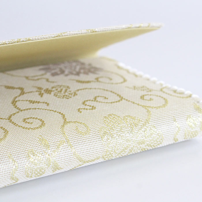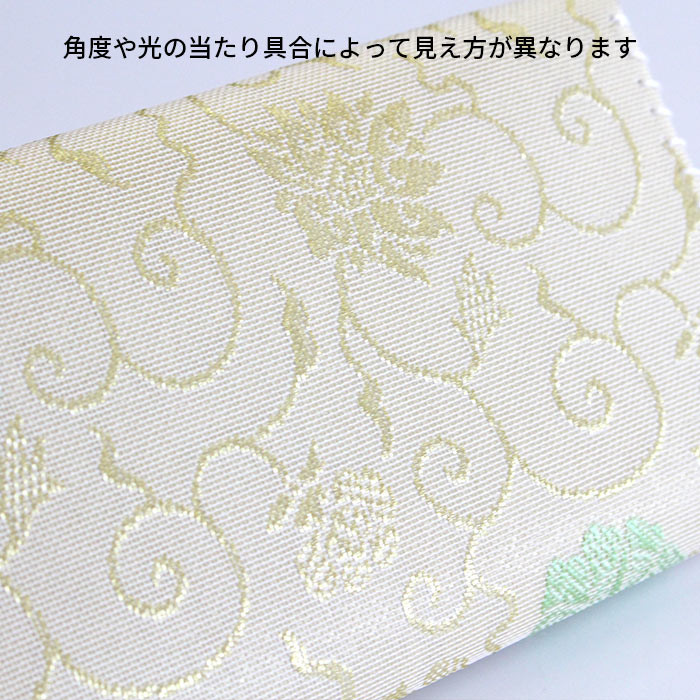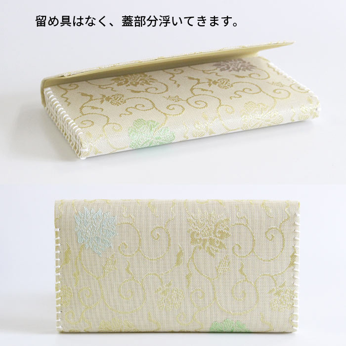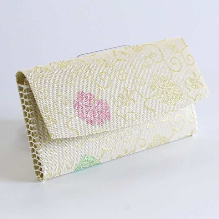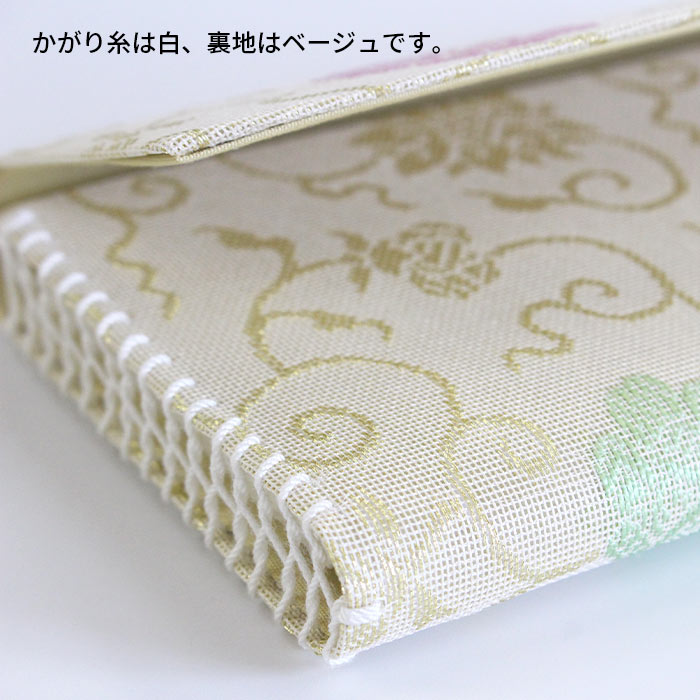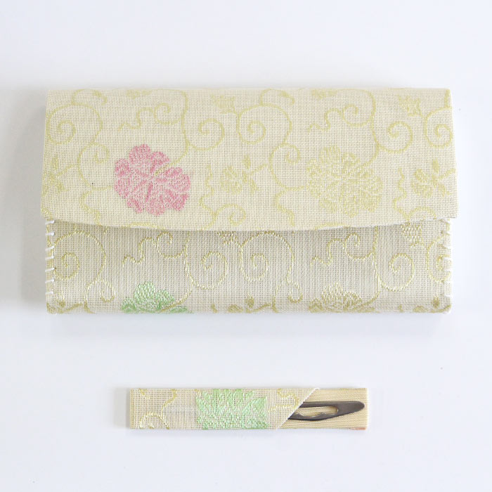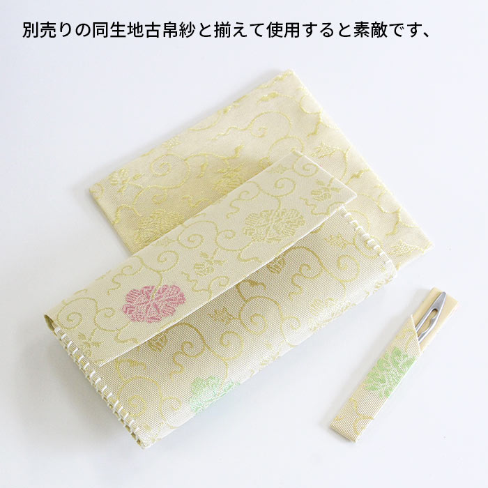 名物裂 正絹 紗 懐紙入と楊枝の2点セットです。同じ生地で揃えておりますので統一感があります。夏素材で涼し気です。 懐紙入の内地はベージュ、ホックなどの留め具はありません。簡易的な内ポケットが一つあります。お茶券やチケットなど入れておくのに便利です。お稽古道具一式を収納できます。楊枝はステンレス製のものをお付けしております。 《名物裂とは》 名物裂とは、絹織物の呼び名のひとつで、茶の湯において、名物と呼ばれた茶道具を入れる袋や袱紗掛け物の表装、帯地などに用いられた布地の総称のことを指します。 《懐紙入とは》 帛紗ばさみ・帛紗バッグとも言います。お茶のお稽古やお茶会に必要な道具をひとつにまとめて入れておくものです。蓋のあるものを三ツ折といいます。 《裂地の説明 牡丹竹屋町文様》 一重牡丹唐草文様の、竹屋町裂を織り出した文様です。 竹屋町の名称は、中国より松屋、銭屋某が織り方を伝授され、京都の竹屋町で織り出した金紗、金絽の総称です。文様は、牡丹唐草の花部分に色糸を用い華やかさを表現した意匠で、涼し気な紗組織に豪華な趣を感じさせてくれる裂です。