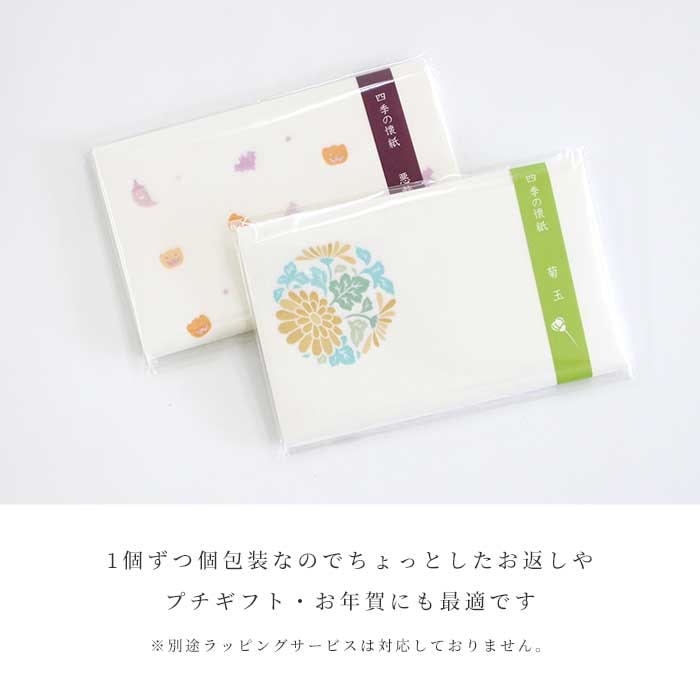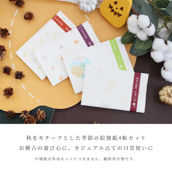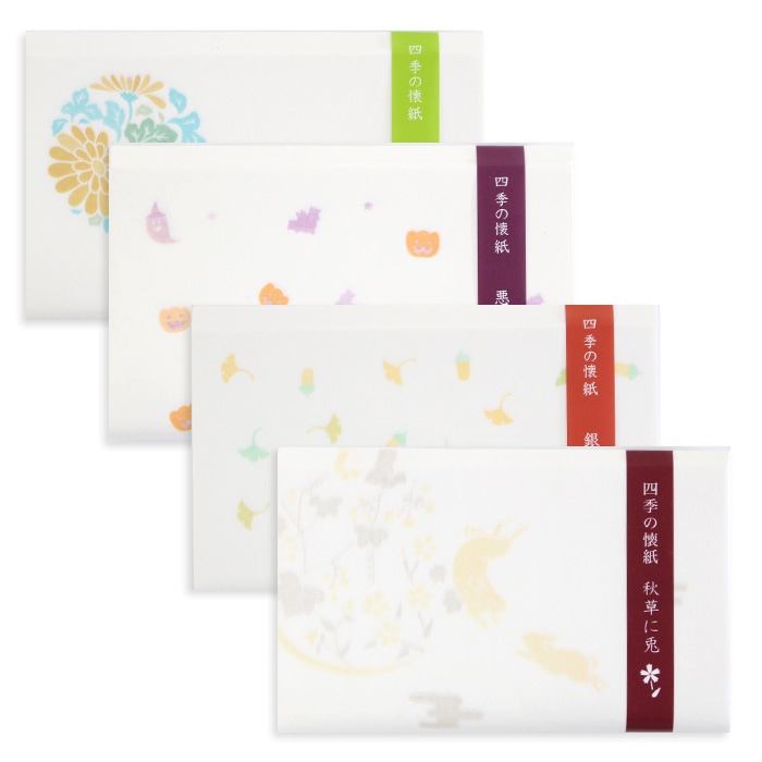 秋の絵懐紙4帖セットです。季節の花々やハロウィン・お月見兎など秋をイメージさせる可愛い柄で揃えました。1帖ずつ個包装でのお届けです。ちょっとしたお返しやプチギフトにもご活用いただけます。 今回はプラス1帖おまけ付♪どんな柄が届くかはお愉しみに。